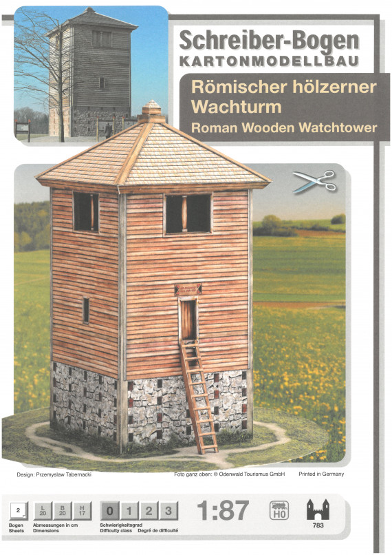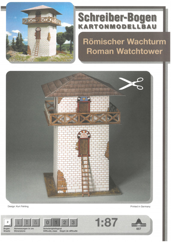 Ein solcher steinerner Wachturm stand an vielen Stellen entlang des Rätischen Limes'. Da sich in den seltensten Fällen mehr als das Fundament erhalten hat, zeigt dieser Bastelbogen eine mögliche Rekonstruktion. Die weiß verputzten Wände mit rot gestrichenen Fugen, die Steinquader anzeigen sollen, sind für die Außenmauern für Kastelle belegt und erzielen damit ein schönes, symbolträchtiges Aussehen.
