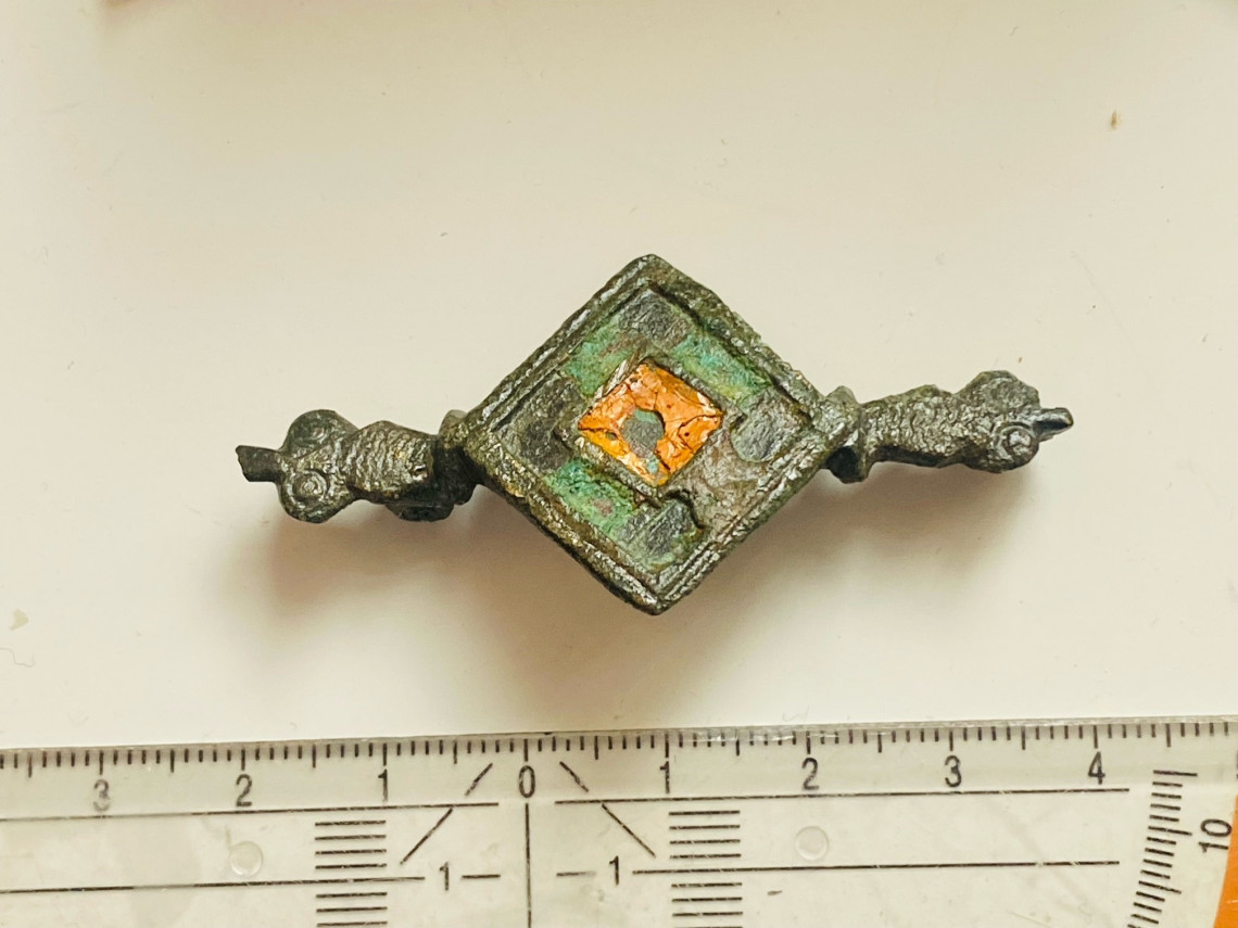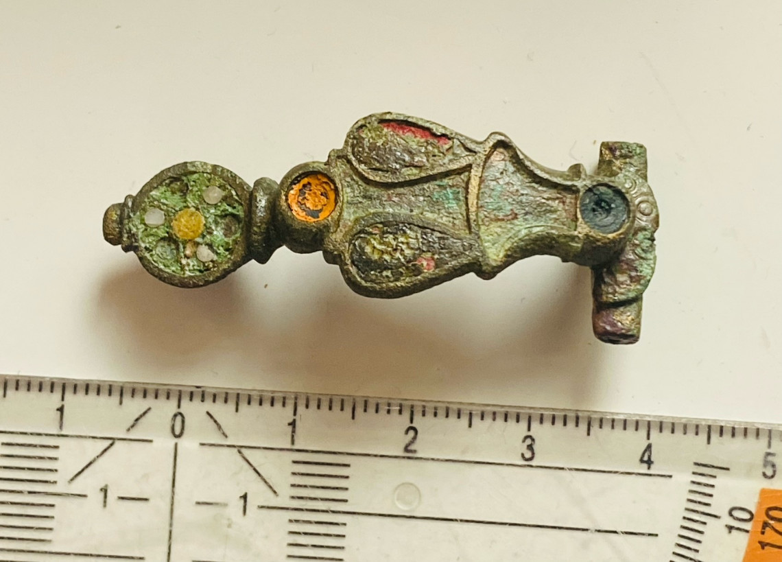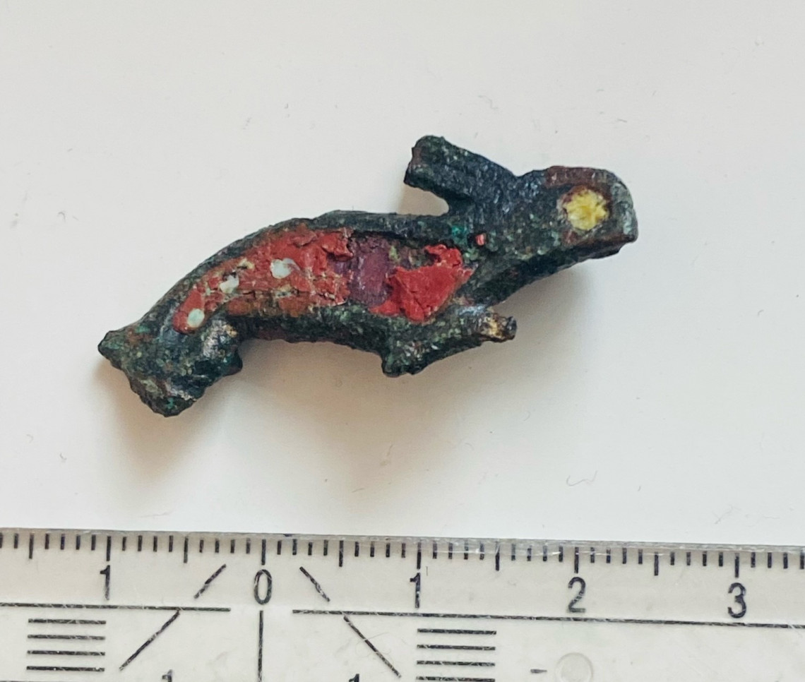 Fibeln mit Emaille-Einlagen konnten auch Tiere, wie z.B. einen Hasen, darstellen oder eine Mischung verschiedener geometrischer Formen.
