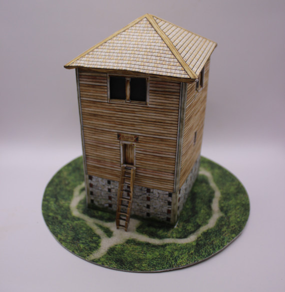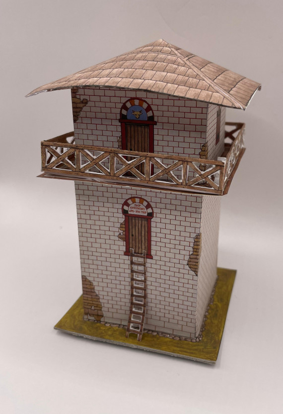 Ein solcher steinerner Wachturm stand an vielen Stellen entlang des Raetischen Limes'. Da sich in den seltensten Fällen mehr als das Fundament erhalten hat, zeigt dieser Bastelbogen eine mögliche Rekonstruktion. Die weiß verputzten Wände mit rot gestrichenen Fugen, die Steinquader anzeigen sollen, sind für die Außenmauern für Kastelle belegt und erzielen damit ein schönes, symbolträchtiges Aussehen.