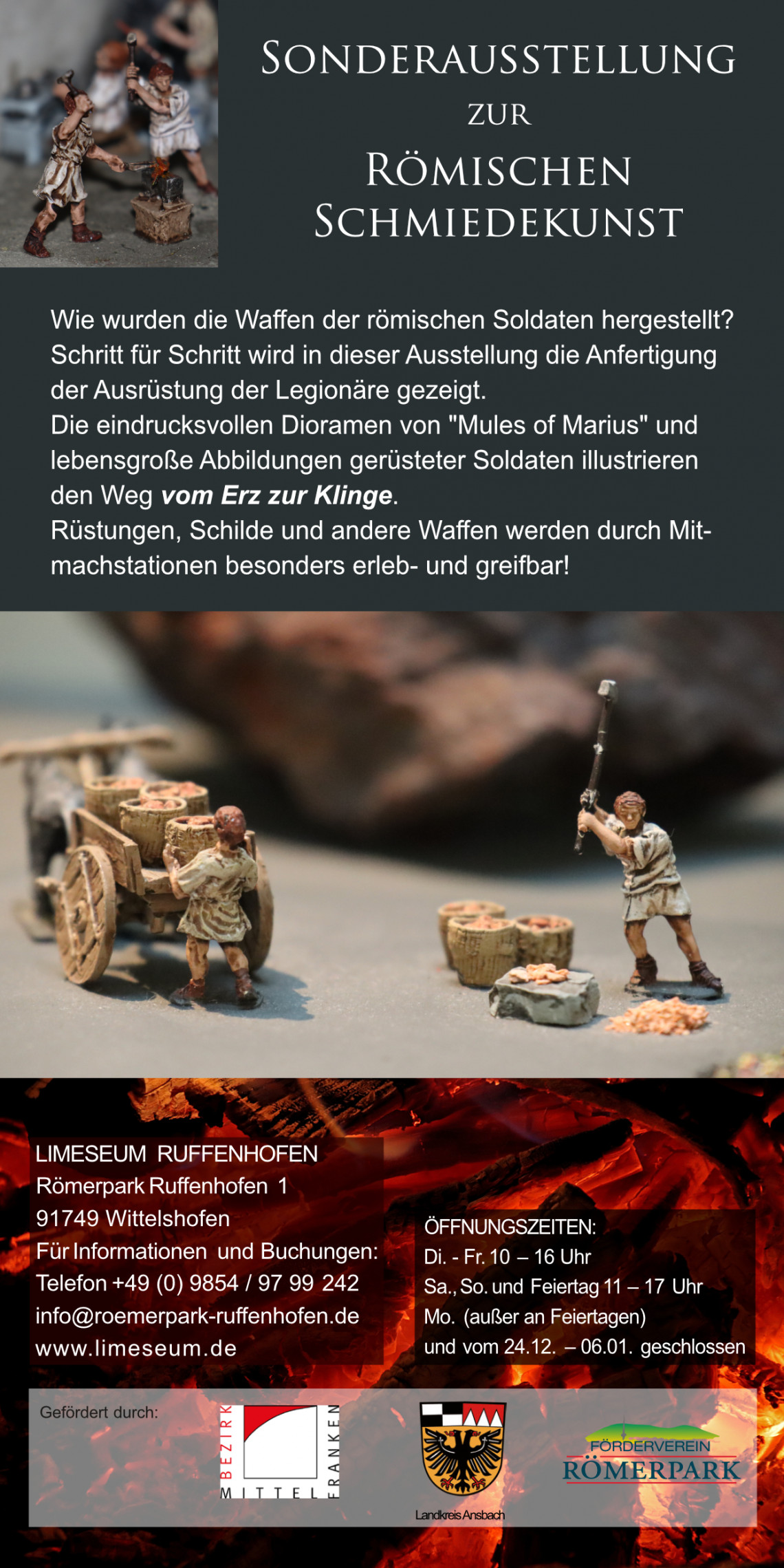 Römisches Geld bildete die Grundlage für den Handel, diente aber zugleich auch der Nachrichtenübermittlung. Durch Münzbilder gelangten wichtige Informationen zur Innen- und Außenpolitik an den Limes. Was steckt dahinter? Wie gut verstanden die Einheimischen diese Szenen? Gab es Münzfälscher? Diese und viele andere Fragen rund ums römische Geld werden in der Sonderausstellung erläutert.